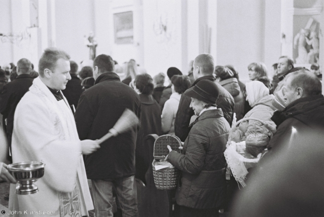 Blessing of Easter Bread and Eggs, Roman Catholic Cathedral of Mjensk, Holy Saturday 2012. Асьвячэньне кулічоў і яек, архікатэдра Імя Найсьвяцейшай Панны Марыі ў Менску, Вялікая Субота 2012 год. Priests carry out blessings continually as the cathedral in Mjensk repeatedly fills up throughout Holy Saturday.